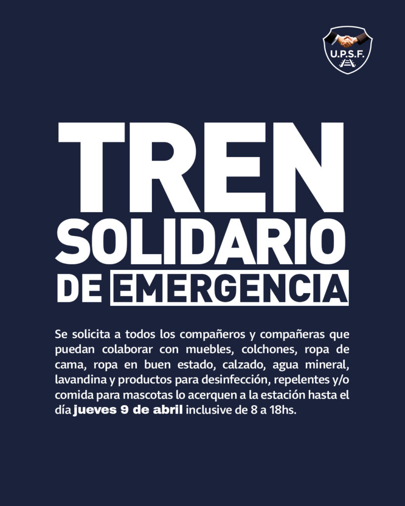 Se solicita a todos los compañeros y compañeras que puedan colaborar con muebles, colchones, ropa de cama, roma en buen estado, calzado, agua mineral, lavandina y productos para desinfección, repelentes y comida para mascotas lo acerquen a la estación hasta el día jueves inclusive de 8 a 18hs.
